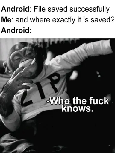 I can find files just fine on my Android phone, BUT when saving files on my iPad this meme would be true.