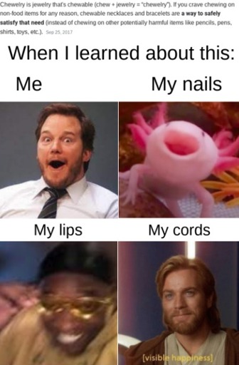 minus-squarekartoffelsaft@programming.devlinkfedilinkarrow-up1·edit-25 months agoI used to do it with a pair of headphones as a teenager. There was (and still is, thinking about it) enough of a gap between my first and second premolars to fit a cord. It’s like the same appeal as a fidget cube, only not healthy. edit: premolars not molars