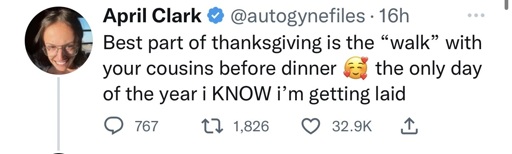 Typically the joke is that you escape family on Thanksgiving with your cousins to go on a walk and get high before returning. This twists it and adds incest