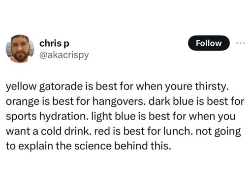 Water is best when you’re thirsty. Water is best for hangovers. Water is best for sports hydrations. Cold water is best when you want a cold drink. Water is best for lunch. Drink more water.