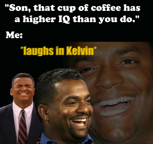 Kelvin is an absolute temp scale, it equals °C + 273.15. So even a 20°C cup of coffee (68°F, colder than ambient…) is 293 kelvin. IQ only goes up to 200 so that coffee is smarter than Einstein…