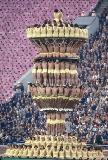 I’m not sure whether this was meant as an athletic or purely aesthetic display – since they’re billed as ‘acrobats’, I assumed skill was involved, so what would be the best and worst case scenario those 8-10 in the narrowest tier would be supporting?