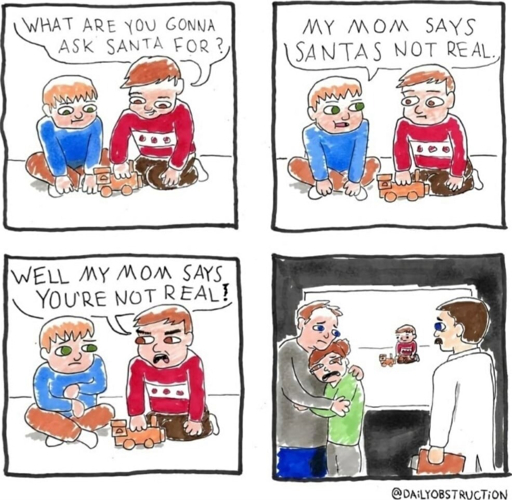Whose mom, red sweater kid’s? Oh, so it’s his own imaginary friend that he doesn’t get along with. And she’s crying because… her child is insane? Or because he’s mean… Okay.