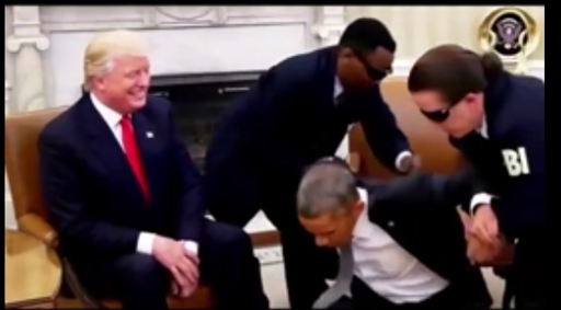 Donald Trump put up a video of President Barack Obama being arrested by the FBI in the Oval Office as you can see in the screen grab. Trump is exceedingly happy about it, of course. The video starts with Obama and a number of Democrats all saying "No...