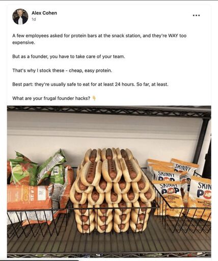 There is no way that a hundred hotdogs that you have to throw out at the end of every day are less expensive than a bunch of off brand protein bars that will never expire until eaten