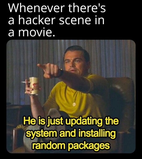 The Chad move would be to have one such scene that looks normal to casual observers, but then turns out the hacker has an automated scanning tool running in the background of the screen, while they’re just typing nonsense in the command prompt.