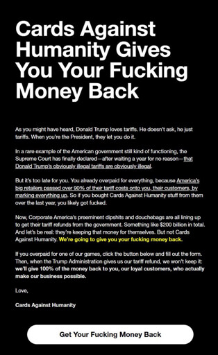 UnderpantsWeevil@lemmy.world to Not The Onion@lemmy.worldEnglish · 8 days agoCAH Gives You Your Fucking Money Backlemmy.worldimagemessage-square72linkfedilinkarrow-up11.76Karrow-down110