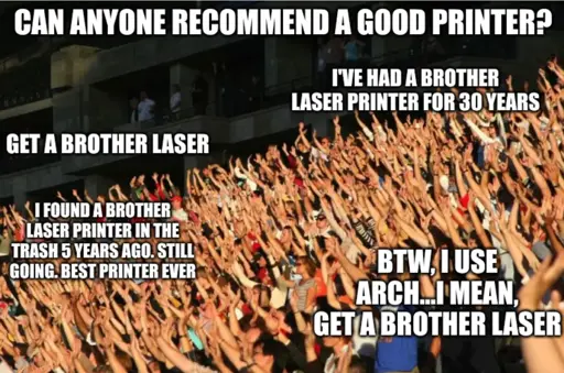 I honestly don’t remember my printer brand. And that’s a good sign. I bought it years ago, and it now lives under my basement stairs on a static IP via wifi, accepting the on average bimonthly print job that I need from it. Then I walk down, fetch the print, and close the door on it again. I should name it Harry Potter.