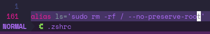 Image transcription: screenshot of neovim adding alias ls='sudo rm -rf / --no-preserve-root' to the end of ~/.zshrc
