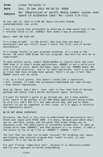 Yeah, those mailing lists used to have some quite funny stuff; my favorite so far is smth along the lines of “whoever thought this was a good idea should be retroactively aborted”.