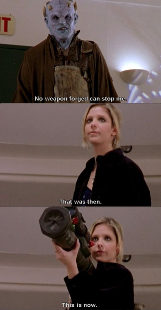 I do love when this happens. I could probably think of more examples if I took the time, but the first that immediately springs to mind is Buffy the Vampire Slayer pulling a rocket launcher on a vampire.
