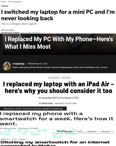 - I love the amazing advances in hardware and general tech that enabled this progression. - However, what I am finding only works better and better for my brain and well-being is to push in the opposite direction. I went from wearing a smart watch 23 hours a day, 365 days of the year for several years, to not even knowing where it is right now. - I do most of my computing/gaming/browsing on an old desktop PC running Linux. I just replaced the fans in one of the PCs that’s 15 years old because they sounded like a locomotive. - The best part though is getting up to get a drink, hit the restroom, or even go chill outside with my pets for an hour and just leave my phone wherever it’s sitting. Just some time to exist and pay attention to my senses and the world around me without getting fucking notifications. - Or hell, even being at work and literally working on technology while being isolated from the outside tech world trying to get my attention. - Though if you have a smart watch that can save you from missing notifications during those times. That’s why mine had to go, lol. - I’ve worn a pebble smartwatch for a decade just to avoid all the annoying noises our phones make non stop. So i keep my phone on silent and I’ve got the pebble set to only get notifications for texts and calls neither of which i get a ton of on a daily basis. I like to be able to glance down and either ignore or pull out my phone and deal with. - I am also a big fan of leaving my phone in the other room and dont wear the pebble a lot on weekends just to get a break. - I’ve never had a pebble but they always looked great. If I wanted to go back to a smart watch but keep it more watch-like and less “tiny phone stuck to my body” then I’d be checking them out. - The benefit you described is one of the things that led me to wear one for so long. You get notifications silently yet they can be attention-grabbing (adhd sends its regards), and you can check them or the time or the weather without fumbling with your phone.