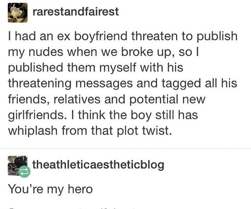 In that situation you’re still admitting the threats have power over you; by releasing the photos yourself, you both out the person as fucking scum and demonstrate that their threat was completely impotent, delivering a one-two punch to the ego.