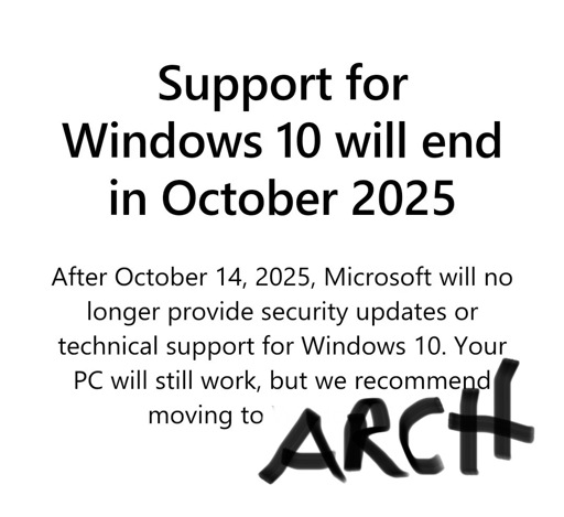 zcd@lemmy.ca to linuxmemes@lemmy.world · 2 years agoWindows 10 EOL PSAlemmy.caimagemessage-square0linkfedilinkarrow-up13arrow-down10